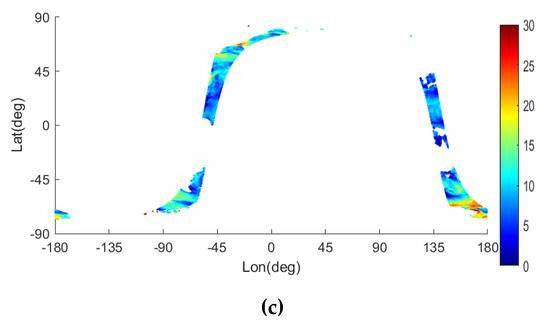 The wind inversion for CFOSCAT is based on the National Aeronautics and Space Administration Scatterometer GMF version 4 (NSCAT-4) [8]. The results are illustrated in Figure 8, Figure 9, Figure 10 and Figure 11. Figure 8 shows the wind speed from the ground L2 products in (a), and the on-board wind inversion results were obtained in procedures described in Section 3. For (b) of Figure 8, resampled GMF LUTs in on-board inversion procedures were used for generating wind speeds. The horizontal axis is longitude, and the vertical axis is latitude. The resolution of the resampled GMF was of 0.4 m/s in the wind speed dimension. The other dimensions were the same as those at full resolution, as the step length in the incidence angles is 0.1°, in the wind directions is 0.5°, and 0.1 m/s in the wind speeds. The color in Figure 8 indicates wind speed amplitude in m/s. It can be observed that the wind speeds were of similar features for the three products. A randomly selected region from Figure 8 is shown in Figure 9. The horizontal and vertical axes, color bar, and products corresponding to (a), (b), and (c) are the same as those of Figure 8. The black arrows in Figure 9 indicate wind directions.
