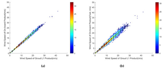 In Figure 7a, it can also be observed that the ground products and on-board NRCS had a good consistency. When on-board results were obtained in coarser LUTs, as shown in (b) and (c), more random noise was aroused. The biases of (b) and (c) to the eground products were similar to those from the on-board, full resolution LUTs. In Figure 7, due to the more random noise expressed in dB, the regions in (b) and (c) with denser samples (deeper red) have a larger slope towards the negative direction of the vertical axis in (c) than (b), while in (a), such a feature is not shown. This is consistent with the conclusion that when the coarser LUTs were used, noisier products were obtained. Specific effects on wind products are provided later in this section. Figure 5, Figure 6 and Figure 7 were derived from VV (transmitted and received in vertical polarization) observations. HH (transmitted and received in horizontal polarization) observations shared similar features and are not listed. For the wind inversion procedure, both polarized observations were applied with a resampled GMF LUT in both polarizations.