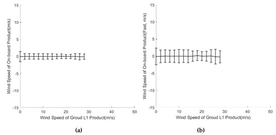 Figure 10 shows correlation and error bars between the ground L2 product wind speed and the on-board wind speeds, Figure 11 demonstrates the mean differences and error bars of the ground L2 product wind direction and on-board wind directions. Statistics came from the results of the whole dataset, as in Figure 8. Ground winds were used as references. The statistics of wind speed were obtained in a bin size of 2 m/s. Mean differences and stdev. in wind direction were calculated for different wind speed bins via the same procedure that was used for wind speed error analysis. In Figure 10, the horizontal axis represents the wind speeds from the ground L2 products, and the vertical axis represents the on-board wind speeds derived from a full-resolution GMF LUT (a) and that from a resampled GMF LUT (b). The mean absolute average differences of (a) and (b) are 0.14 and 0.17 m/s, respectively. The lowest and highest wind speed values were obtained from the 0 m/s and 28 m/s in wind speed, and these extreamly low and high speeds are of higher noise level in wind inversion and GMF themselves. For most wind speeds, (b) had slightly larger average differences than (a). The smallest average differences for both (a) and (b) were both at 18 m/s. The largest stdev. of (a) and (b) also appeared at 24 m/s when mean differences were the largest at 0.84 and 1.55 m/s, respectively. The smallest stdev. values for (a) and (b) were all at 2 m/s as 0.55 and 0.56 m/s, respectively. It can be observed from Figure 10 that (b) shows larger stdev. values than (a), indicating larger variance and more noise from the coarser GMF LUT. The better consistency observed in (a) also corresponded with the fact that, for ground wind inversion, interpolation was also employed to improve retrieval wind quality [39]. In Figure 11, it can be seen that the average differences in all wind speed bins for wind directions were close to 0°. However, there was an increase at 18 m/s from 0.06° to 0.15° and at 26 m/s from −0.07° to −0.16°. These two bins also formed the second largest and largest average differences in wind direction. The trend of larger stdev. values for (b) than (a) is easy to see in Figure 11. The stdev. values are almost doubled in (b) taking reference from (a).