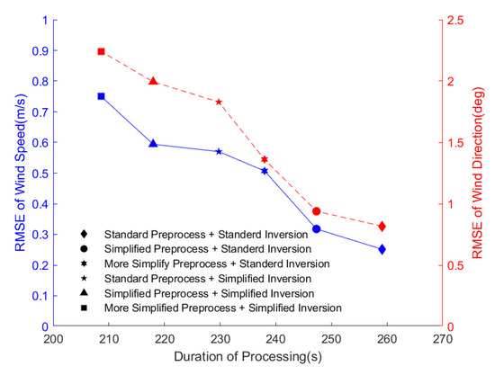 From Figure 5, Figure 6, Figure 7, Figure 8, Figure 9, Figure 10 and Figure 11, it can be concluded that processing methods and LUTs proposed in this research for on-board processing can achieve good results for scatterometer wind compared with ground products. Better resolution LUTs for on-board processing are necessary for providing RT winds in good quality. To obtain a finer resolution of LUTs requires a longer processing time. The cost of calculation versus accuracy for on-board procedures is given in Figure 12, where the term standard represents full resolution LUTs applied in corresponding procedures. Simplified means that the half-number resampled LUTs, and more simplified indicates a quarter number of resampling in LUTs. The combination of different LUTs in pre-processing and inversion is expressed by different shapes. The solid curve is for wind speed, and the dashed curve represents wind direction. The RMSE value reached the minimum and time cost is the largest when using full resolution LUTs in both preprocessing and inversion. CFOSCAT takes up to 260 seconds (s) for obtaining this track of data. When excluding observation time, it generates L0 data at the speed of 1.3 GB/h [43]. According to processing procedures described in Section 2, it can be found that the L1 and L2 products takes 0.8 and 0.06 GB/h respectively. The observing duration for a track of data was 95 min; under this on-board processing environment, data processing would cost around 165 s for a track. On average, this constitutes about a maximum of 2.95 min for observing a WVC in CFOSCAT. To complete adjacent WVCs for this kind of WVC, 5.9 min are required. Time is mainly consumed in the scatterometer observing procedure. For ground products involving ground stations for receiving, products are generally distributed in unit tracks. The on-board wind products are distributed based on the unit of a WVC with a much shorter product distribution duration. It can be concluded that full resolution LUTs can be applied for on-board wind inversion, while a comparable accuracy with ground products can be obtained in an on-board environment for RT applications.
