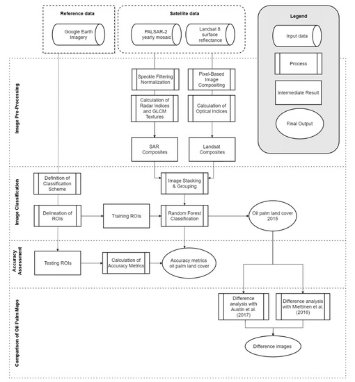 Our workflow includes the following steps: image pre-processing, image classification, accuracy assessment, and comparison with other oil palm maps (Figure 1). Image pre-processing for Landsat imagery removed cloud cover from the surface reflectance Landsat product to create the best available pixel image composite, while that of PALSAR imagery included speckle filtering and conversion of normalized radar cross-sections, as well as the calculation of texture measures and indices. Image classification involved the creation of image stacks using Landsat and PALSAR layers, drawing regions of interest and classifying the image using a machine learning classifier. Three stacks of data layers were created for image classification: PALSAR-only layers (‘synthetic aperture radar (SAR) layer’), Landsat-only layers (‘Landsat layer’), and a combination of Landsat and SAR layers (‘Combined layer’). Accuracy assessments were conducted for SAR, Landsat, and Combined layers to evaluate which map produced the best oil palm extent map. We compared our best oil palm land-cover map based on overall classification accuracy with Miettinen2016 and Austin2017 (1) by examining areas of disagreement against high-resolution Google Earth Pro imagery and (2) by calculating pairwise Jaccard similarity for oil palm cover between the best map produced from our image classification and each of the two existing maps.