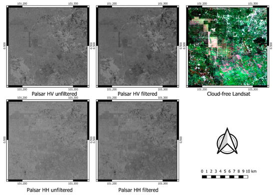Our 2015 SAR mosaic was obtained from the seamless yearly mosaic available on the Google Earth Engine database and clipped around Sumatra, our area of interest. We applied a 3 × 3 Refined Lee filter on each channel, HH and HV, to smoothen the image, reduce the speckle effects in the raw SAR imagery, and conserve the information of the edges and linear features between two land-cover types [47]. The digital numbers of the HH and HV images were converted into sigma-naught values, following Equation (1).