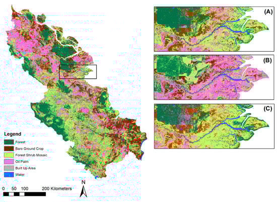 Classified image for Riau, Jambi, and South Sumatra using our Combined image stack. Insets focus on the border of Riau and Jambi for (A) Combined, (B) SAR, and (C) Landsat classified images.