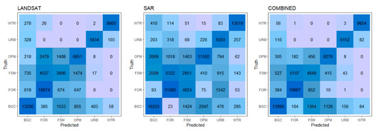 Error matrices of the three classifications for Landsat, SAR, and Combined maps. Values in each cell represent the number of testing pixels for each land-cover class.
