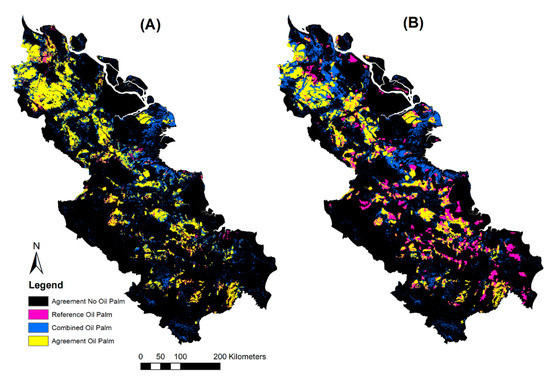 Our semi-automated supervised 30 m Combined map was at a higher resolution compared to Miettinen2016, which used Sentinel-1 C-band radar data (20 m) that was resampled to 250 m to match MODIS images [30]. This difference in spatial resolution and Miettinen2016’s definition of palm plantations as contiguous closed canopy plantations larger than 1 km2 could be one reason for the difference in oil palm area (Combined map had 47% larger extent), as well as the differences in misclassification, where a higher proportion of oil palm points were forest land-cover under Miettinen2016, as compared to a higher proportion of oil palm points as bare ground cover under the Combined map (Figure 6). While some pixels from Miettinen2016 could be coconut and sago palm plantations, the authors visually inspected and removed any potential misclassified areas to avoid classification errors. This was not carried out in our study. Given that coconut and sago plantations are prominent along the coasts of Sumatra (Lee J.S.H. pers. obs.), the large extents of disagreement between our Combined map and Miettinen2016 on the east coast of Sumatra (Figure 5A) are likely coconut and sago plantations misclassified as oil palm in our Combined map. Our results support previous studies that found higher accuracies using supervised methods [61,62,63].