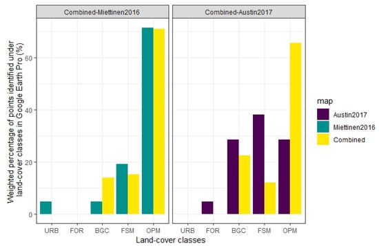 Of the 100 random sample points for our Combined-Miettinen2016 comparison, 79 points were drawn from the Combined map and 21 points were drawn from the Miettinen2016 map. Whereas, for our Combined-Austin2017 map, 58 points were drawn from the Combined map, while 42 points were drawn from the Austin2017 map. We calculated the weighted percentage of points for each land-cover class using the total number of points identified under each map above (Figure 6).