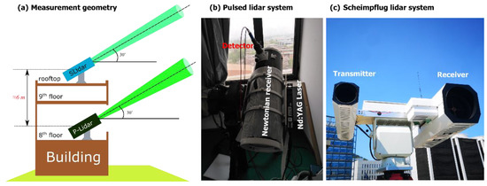 (a) Measurement geometry, (b) the picture of the pulsed lidar system, and (c) the picture of the Scheimpflug lidar system. The water-proofed SLidar system was placed on the rooftop of the building, while the pulsed lidar system was located inside a laboratory.