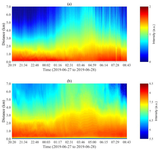 Atmospheric backscattering signals measured by (a) the SLidar system and (b) the pulsed lidar system from 27 June 2019 to 28 June 2019 (Local time) on a near horizontal path.