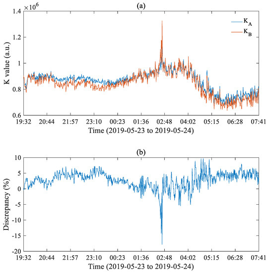 As can be seen in Figure 5a, the system constant has shown a clear temporal variation, indicating substantial drifting of the system parameters, e.g., the emitted laser power. However, the values of KA and KB were still rather close to each other. The relative discrepancy between KA and KB, namely (KA − KB)/KA, was generally less than 10% as shown in Figure 5b, apart from the lidar curves measured at around 02:30. The suddenly increased system constant as well as the discrepancy could be due to the appearing of the aerosol load beyond 1 km, resulting in substantial heterogeneity of the aerosol distribution in the measurement volume, as can be seen from the inset of Figure 2a.