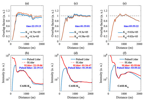 Overlap factors were evaluated in different atmospheric conditions according to Equation (1) using the system constants obtained in the two regions, as shown in Figure 6. The system constants calibrated in the region of 500–1500 m and 1050–1500 m were referred to as KA and KB, respectively. The lidar signal measured by the SLidar system has been multiplied by the system constant KA. As can be seen, the overlap factor has also shown clear temporal variations. Moreover, the overlap factor in the region of 500–2000 m did not equal to 1; it instead fluctuated around 1. The fluctuation may reach up to 20% around 2000 m, as shown in Figure 6e. This indicated that the atmospheric backscattering signals measured by the pulsed lidar system and the SLidar system were not fully identical. A main reason for the discrepancies between the lidar curves was that the pulsed lidar system and the SLidar system did not exactly measure the same volume, in spite that they were very close to each other (6 m away in horizontal direction). The atmospheric heterogeneity can introduce large discrepancies on the lidar curves, as shown in Figure 6e,f. On the other hand, the difference in range resolution between the SLidar technique and the pulsed lidar technique could also influence the calibration of the overlap factor, particularly in the near range. As can be seen in Figure 6e, a small dip was observed in the overlap factor. Moreover, Simeonov et al. have shown that the spatial uniformity of the PMT could have significant influence on the lidar signal particularly for the near range lidar curves [54].