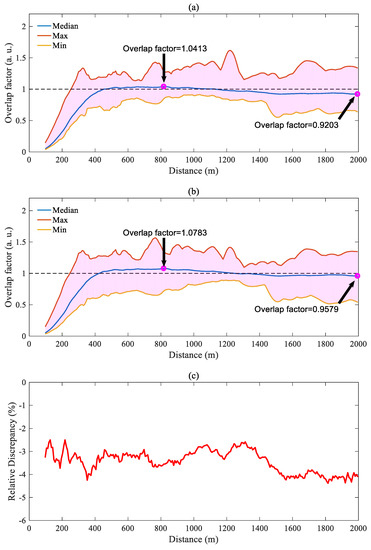 Statistical analysis on the overlap factor has been performed by investigating the overlap factor retrieved during the whole measurement period. The statistical maximum, minimum and median values of the overlap factor, evaluated from lidar curves recorded during the whole measurement period, are shown in Figure 7a,b. It can be found out that the overlap factor was less than one for a measurement distance less than 500 m. The maximum and the minimum boundary of the overlap factor indicated the fluctuations of the lidar signals measured by the two systems, due to atmospheric heterogeneity, and varying range resolution of the SLidar technique, etc. Nevertheless, the influence of the atmospheric heterogeneity can be mitigated in the median value of the overlap factor. In the region between 500–2000 m, the deviation of the median overlap factor to one was between −8% and 4% for the system constant calibrated in the region A, while it varied between −4% and 8% for the system constant calibrated in the region B. The relative discrepancy between the median overlap factors was also less than 5%, as shown in Figure 7c, implying a promising result of employing both regions A and B for the calibration of the system constant and thus the overlap factor.