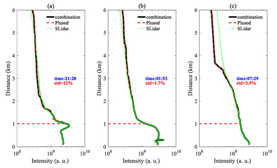 Combination of the lidar curves measured by the pulsed lidar system and the SLidar system at (a) 21:28, (b) 01:53, and (c) 07:29.