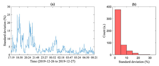 Figure 9 shows the glued lidar curves and the corresponding standard deviations under different atmospheric conditions. The standard deviation generally increased, when large atmospheric variation in vertical direction appeared. Statistical analysis on the standard deviation has also been performed. As shown in Figure 10a, the standard deviation was generally less than 25%, with a mean value of 4%. The relatively larger standard deviation mainly occurred for the lidar curves with large spatial variations. The lidar curves measured during the early morning also had a rather small standard deviation, although the SNR deteriorated due to the increasing of the sunlight background. In summary, most glued lidar curves (90% of the measurements) had a standard deviation less than 10%, as indicated by Figure 10b. The temporal and spatial distribution of the glued atmospheric backscattering signal, covering the range from 90 m to 28 km, is shown in Figure 11.