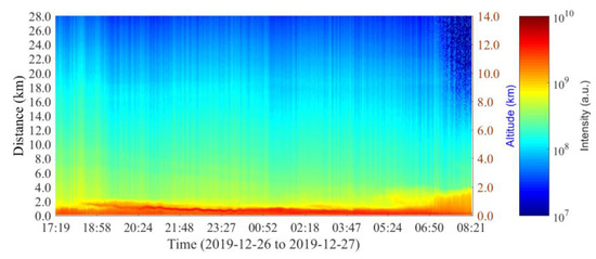 Atmospheric backscattering intensities measured by (a) the pulsed lidar system and (b) the SLidar system from 17:19 on 26th December to the early morning (after sunrise) on 27th December 2019 (Local time). The blind range of the pulsed lidar system was set to about 1.0 km by adjusting the gating time of the PMT in order to improve the SNR of the lidar curve in the far range.