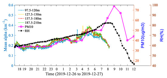 In order to validate the measurement result, the aerosol extinction coefficient retrieved in the near ground (below 200 m distance, 100 m in altitude) was evaluated for comparison studies with the PM10 concentration measured by a pollution monitoring station located at 2.5 km away from the lidar system (Qixianling Station). As shown in Figure 13, the median aerosol extinction coefficients at different altitudes have shown similar temporal variations with the PM10 concentration from 17:00 on 26th December to about 07:00 On 27th December. In the early morning on 27th December (07:00–08:00), the aerosol extinction coefficient quickly decreased possibly due to the growth of the boundary layer driven by sunlight heating, in spite that the relative humidity also increased. However, the PM10 concentration was continuously increasing. Moreover, the PM10 concentrations reported by other pollution monitoring stations, which were several kilometers away from the lidar systems, also increased continuously. The inverse relationship between the aerosol extinction coefficient in 50–100 m altitude and the near ground PM10 concentration implied that the PM10 concentration also had a large spatial variation even in the near surface. On the other hand, the PM10 concentration measured by the Qixianling national station started to decrease after 09:00 on 27 December. This phenomenon further confirmed that the monitoring of the near ground aerosol distribution was of great significance for understanding atmospheric chemistry and environmental monitoring. SLidar systems with even shorter blind range (e.g., 30 m or even 10 m) and all-day measurement capability were highly demanded for future atmospheric aerosol monitoring applications.