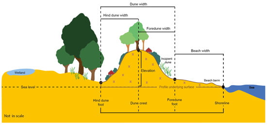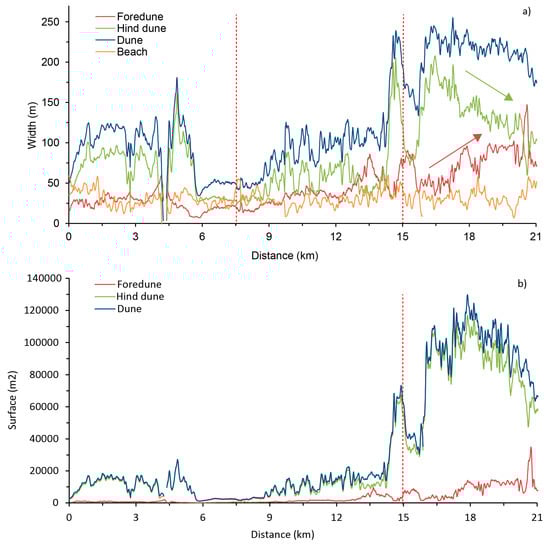 | Width (m) | By using the horizontal plane referred to mean sea level for the following distances: from the shoreline to the foredune foot (beach) from the foredune foot to the crest (foredune) from the crest to the hind dune foot (hind dune) from the foredune foot to the hind dune foot (dune) |