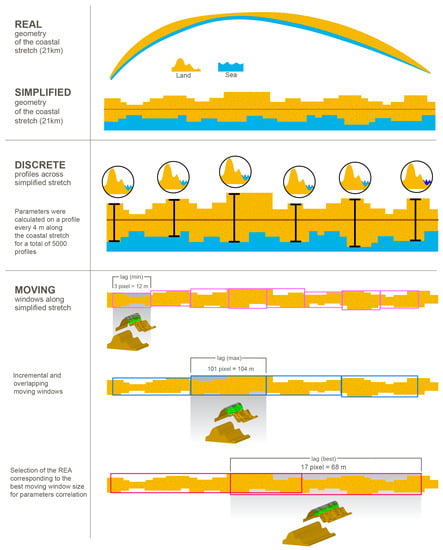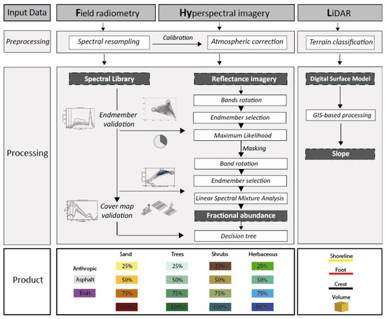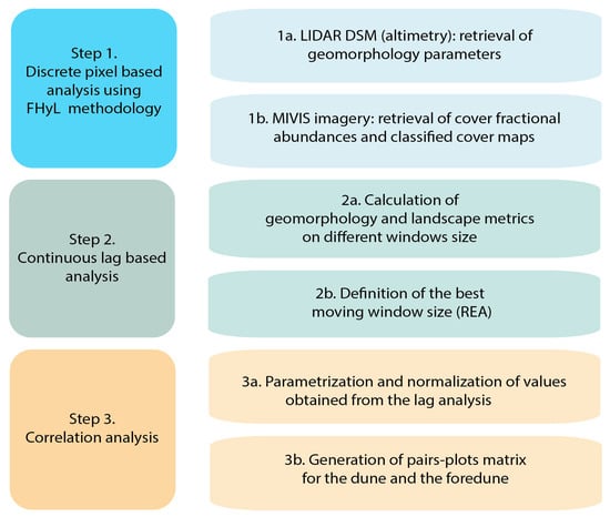- step 1, a discrete pixel-based analysis to explore the whole system metrics and behavior. The processing is based on the algorithm named ‘FHyL (Field spectral libraries, airborne Hyperspectral images and LiDAR altimetry) module 3’, an algorithm comprising four main modules and two pre-processing steps: Each module differs according to the analyzed coastal sphere, i.e., the terrestrial or the aquatic, and according to the sensors’ data integration sequence [31,45];