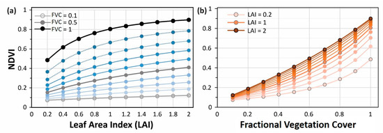 Changes in the Normalized Difference Vegetation Index (NDVI) as a function of increasing Fractional Vegetation Cover (FVC) and Leaf Area Index (LAI): (a) NDVI values per pixel with increasing LAI per unit area of vegetation cover, for different FVC levels within the pixel (light to dark colors); (b) NDVI values per pixel with increasing FVC within the pixel, for different level of LAI per unit area of vegetation cover (light to dark colors).