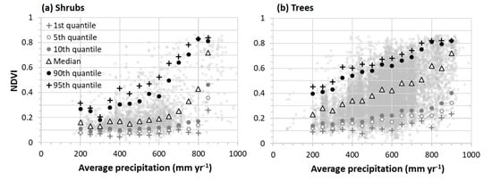 Changes in the Normalized Difference Vegetation Index (NDVI) of shrub and tree cover along the precipitation gradient. Results of all analyzed pixels for shrub cover (a) and for tree cover (b) are shown in gray. Quantiles for each bin of 50 mm of annual precipitation are shown in greyscale symbols overlying the data.