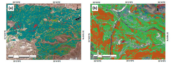 Examples of automatic mapping of woody vegetation in two regions in Israel: (a) Yatir forest (200 mm year−1), and (b) Judean mountains (500 mm year−1); using the tree cover dataset from Hansen et al. [3] (in red), the minimum 0.2 NDVI threshold (in blue), and our suggested dynamic precipitation-sensitive threshold (in green).
