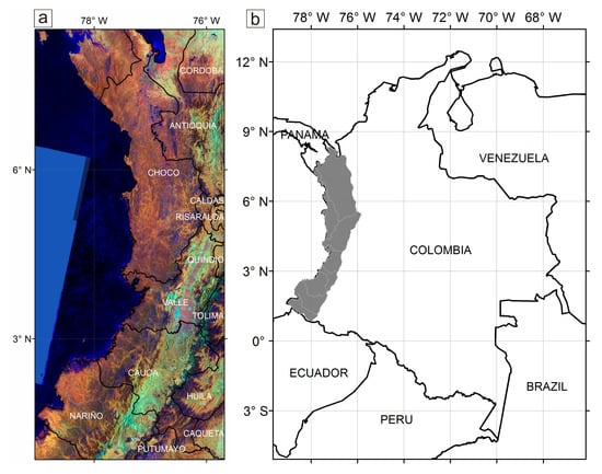 (a) Optical satellite image composite of the Pacific coast of Colombia (RGB NIR-SWIR-RED); black lines are the political boundaries of the departments. (b) Location of Colombia in South America; gray polygons are the limits of the study area. Appendix A has additional information of additional layers.