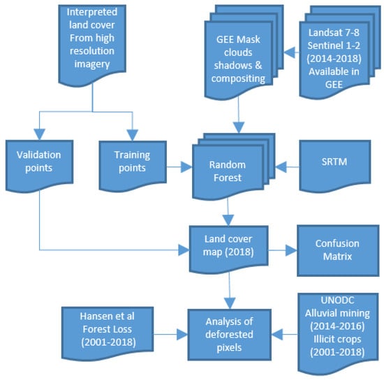The spatially continuous land cover map, with its assessment of accuracy, enable us to determine that approximately 75% of the study area is covered by forests. Despite the persistent cloud cover of humid/pluvial forests, we were able to determine land cover classes and associate each class to forest loss from 2001 to 2018, improving our understanding of the fate of forest loss pixels after disturbance, and forecasting the drivers of further deforestation. We also found that more than half of forest loss is due to the combined effect of alluvial mining and illicit crops, providing more information to decision makers and conservationists about the magnitude of deforestation associated with the main drivers of forest loss.