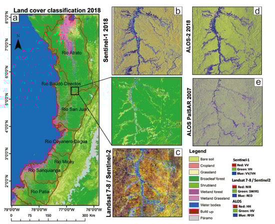 (a) Land cover classes’ extent for the Pacific region with a zoom into the Quito River tributary of the Atrato River, as an example of deforestation due to mining activities. (b) Sentinel C-band (2018). (c) temporal composite Landsat7-8/Sentinel-2 (d) ALOS PalSAR L-band (2018), and (e) ALOS PalSAR 2007. RFDI stands for radar forest degradation index and HH, HV, VV, VH are different polarizations of radar images. See Appendix A for web mapping functionality.