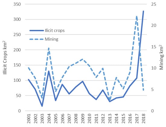Based on UNODC delimitation, areas under the influence of alluvial mining, illicit crops or both, include 25,609 km2 of the study area. Forest loss where mining occurs sum to 140 km2, while forest loss where illicit crops occur sum to 1181 km2, and forest loss where both drivers occur sum to 77 km2. Both drivers were present during the 2001–2018 period. Similar patterns of the drivers of forest loss (Figure 4) are partially due to the fact that areas of illicit crops and alluvial mining overlap, indicating their coexistence in this biodiversity hotspot. A major change in this pattern was found for 2018 when forest loss increase was associated mainly with illicit crops.