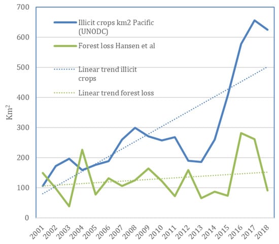 Patterns of total coca crops estimated by the United Nations Office on Drugs and Crime [,,] and Hansen et al. [] estimated deforestation.