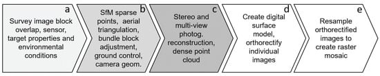 The major steps required to create an orthrectified image mosaic include (a) operator decisions and sensor; (b) structure from motion (SfM) and iterative algorithms to reconstruct camera pose; (c) photogrammetric matching algorithms; (d) filtering and surface model reconstruction; (e) raster prioritisation, resampling and/or blending.