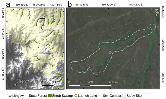 (a) Location of the study site relative to Lithgow, Newnes State Forest, and other mapped shrub swamp communities shown with a hillshade digital elevation model (USGS Shuttle Radar Topography Mission v2). (b) Study site extent showing launch and landing areas and 10 m contours. Background true colour Sentinel 2 imagery acquired 14 February 2018 (Credit: European Union Sentinel Data).