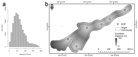 (a) Histogram of distance to nearest GCM mark (10 m bins) for 1 m2 cells covering the buffered study site. (b) Locations of each ground control point with distance.