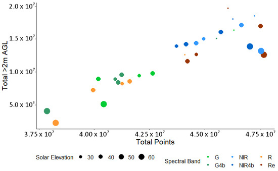 Total dense points in final project compared to total points more than 2 m above ground level (AGL). Processing was conducted for individual cameras (G, green; R, red; NIR, near infrared; red edge, Re) and as a multicamera rig with green (G4b) and NIR (NIR4b). Symbol size is directly related to solar elevation. See specific ranges for each flight in Table 1.