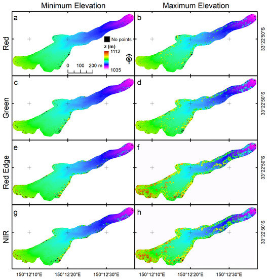 Midday summer multispectral imagery processed to dense point cloud stage as individual cameras and sampled at 2 × 2 pixel resolution (0.16 m GSD) for minimum (a,c,e,g) and maximum (b,d,f,h) dense point elevation.
