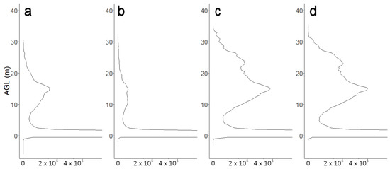 Dense point cloud frequency plots at 0.5 m bin widths for (a) red, (b) green, (c) red edge, and (d) NIR. Point frequencies less than 2 m have been cropped to improve the interpretation of reconstructed points more than 2 m AGL.