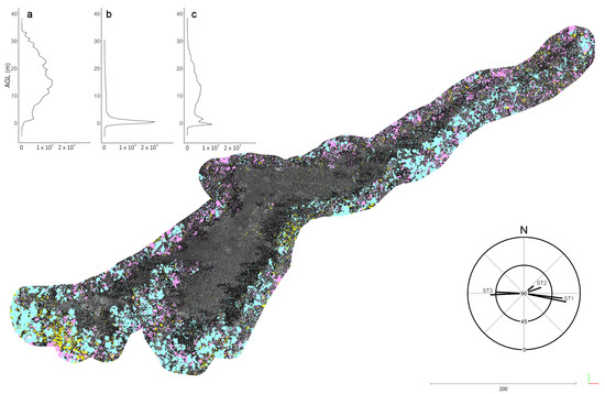 (main) Dense point cloud reconstruction with ST3 (red to yellow) and WT2 (blue) compared to features separated by < 0.5 m in both products combined and displayed as a height ramp (black–white). Elevations for all products are calculated as z distance component from a red cloud 2 m minimum subsample to remove underlying terrain. The relative frequency of uniquely reconstructed point features for (a) ST3 and (b) WT2.