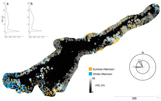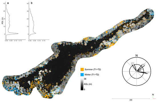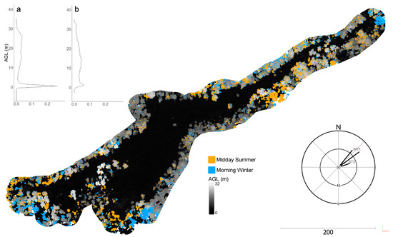 (main) Dense point clouds of reconstructed points within 0.5 m distance to alternate season point cloud (black to white). Unique points in summer (orange) and winter (blue). Relative frequency at different heights AGL for (a) summer and (b) winter.