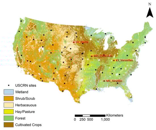 The U.S. Climate Reference Network (USCRN) stations used to retrieve surface soil moisture. The land cover map is obtained from the National Land Cover Database (https://www.mrlc.gov/data/type/land-cover). The red data points are the four USCRN stations of interest in this study.
