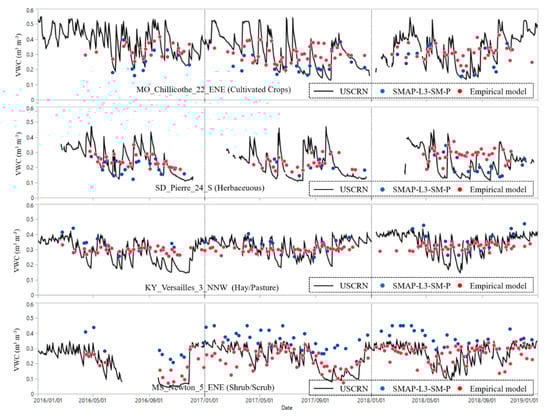 Measured (black line) and predicted soil volumetric water content (VWC, m3 m−3) using the empirical model (red dots) and SMAP-L3-SM-P (blue dots) at four USCRN stations representing Cultivated Crops (MO_Chillicothe), Herbaceous (SD_Pierre), Hay/Pasture (KY_Versailles), and Shrub/Scrub (MS_Newton) during 2016–2018.