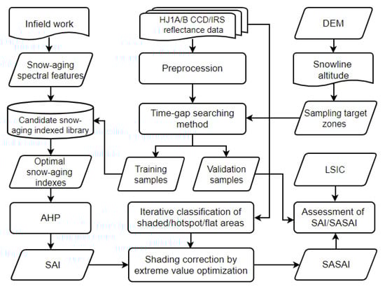 Figure 2 shows the main datasets and methods applied for the shadow-adjusted SAI (SASAI). The in-field work collected the observational SAP parameters and spectra of different snow samples across the MRB. The obtained snow-aging spectral features were used as reference for constructing the candidate snow-aging indexed library. The “time-gap searching method” and target zones obtained from DEM were combined to capture the representative snow-aging training and validation samples from HJ-1A/B CCD/IRS reflectance data. A criterion was constructed to screen out the optimal snow-aging indexes with confidence. By quantifying the contributions of the indexes through the analytic hierarchy process (AHP), snow-aging index (SAI) was constructed. Within the classified areas (shaded/hot spot/flat), a terrain condition adjusted factor determined by an “extreme value optimization” algorithm was applied to adjust the SAI to eliminate its shaded and hot spot effect. Finally, the shading correction and separability of the SAI/SASAI were assessed by the local solar incidence cosine (LSIC) and validation samples.