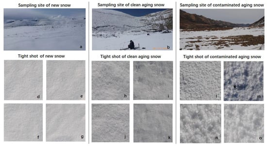 Photographs of infield sampling sites of (a) new snow, (b) clean aging snow, and (c) contaminated aging snow and the tight shots of (d–g) fresh snow, (h–k) clean aging snow, and (l–o) contaminated aging snow with soot.