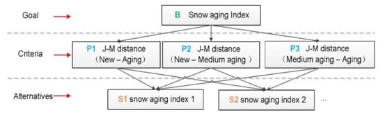 The AHP synthesized multiple well-behaved aging indexes to construct an integrated SAI, which can calibrate the numeric scale for the quantitative and qualitative analyses []. Figure 6 shows the hierarchical structure in terms of goal, criteria, and alternatives. The goal is to construct the SAI B. The Jeffries–Matusita (J–M) separability criterion was set for assessing the statuses (P1, P2, and P3) of the samples. The optimal snow-aging indexes were considered alternatives. The intensity of importance was determined by pairwise comparisons according to the Saaty 1–9-scale method []. The criteria of P1, P2, and P3 was defined as equally important for the B (SAI). The rating of alternatives of S1 and S2 were pair-compared and defined with reference to the J–M separability of indexes for samples, and the weight factors of optimal snow-aging indexes were determined. The formula for SAI is given in Equation (1), where, w represents the weight factors of each optimal index, and the n represents the number of the selected index.