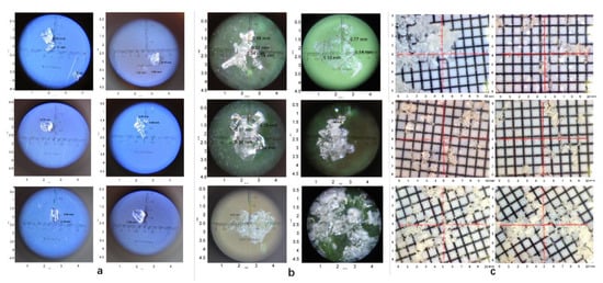 Magnified photographs of the new (a), uncontaminated aging (b), and contaminated aging (c) snow particles with measuring scale.
