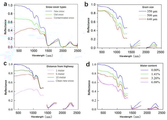 Surface reflectance measured with the ASD FieldSpec4 instrument. (a) Surface reflectance of new, uncontaminated aging, and contaminated snows; (b) Snow surface reflectance for three varying grain sizes; (c) Surface reflectance of new and contaminated snows at different distances from the highway; (d) Snow surface reflectance for different water contents.