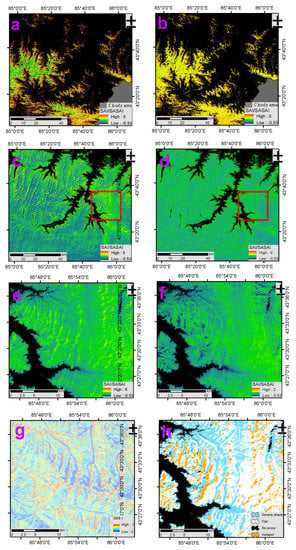 The comparison of the SAI (a,c) and SASAI (b,d) maps on 6 and 9 April 2014; the enlarged SAI (e) and SASAI (f) on 9 April 2014 and the distribution of Cos i (g) and classified terrain types as shaded, flat, and hot spot areas (h).