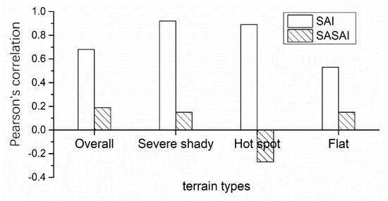 Correlation coefficients between the SAI/SASAI and solar incidence cosine in different terrain types.