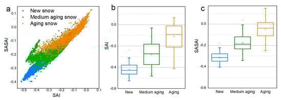 A scatter plot was made to validate the accuracy of the SAI/SASAI with three types of validation samples (Figure 11a). The aim was to demonstrate whether the proposed SAI or SASAI can indicate a significant insight on snow aging. Comparatively, the scatter plot of SASAI shows better separability than SAI. SAI values have a greater degree of overlap when compared with the corresponding SASAI values of the three types of samples. Figure 11b,c show the box plots of SASAI and SAI values for the three types of validation samples, and they indicate that the upper and lower quartile values of SAI and SASAI do not overlap, but the three types of SASAI sample indexes are significantly more concentrated and better distinguished.