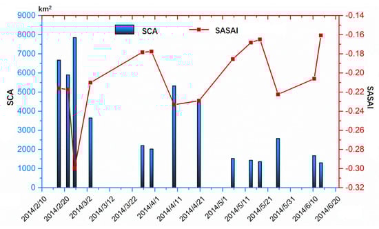 To improve the confidence level and explore the adaptability of the proposed algorithm on multiperiod remote sensing images, the average values of SASAI and SCA of the 14 periods during the snowmelt of 2014 were calculated based on HJ data. As shown in Figure 12, SASAI and SCA have a significantly negative correlation. Each decline cycle is characterized by a gradual decrease in snow and an increase in SASAI. After each new spell of snowfall, the SCA suddenly increased, and the SASAI decreased significantly. Therefore, it can be inferred that the snow-aging index proposed in this paper can identify the snow-aging status. The R2 between the SASAI and the SCA calculated for 14 periods of data is 0.728, which indirectly illustrates the acceptability of SASAI.