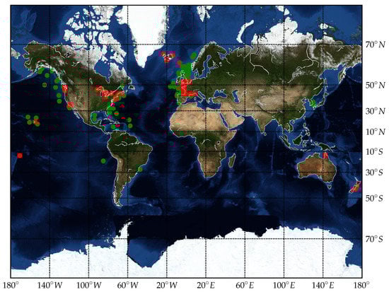 A distribution of the buoys used for validation of Delay-Doppler altimetry (DDA) retrackers. Coastal buoys are shown in red and open-ocean buoys are given in green.