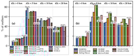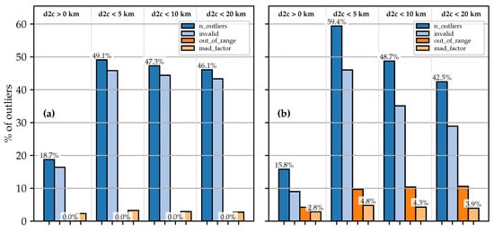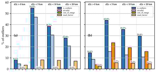 If one of the criteria is applicable, the individual measurement is considered to be an outlier. The evaluated metrics are the total number of outliers and the number of outliers in the coastal zone as a function of the dist2coast, considering bands of less than 20, 10, and 5 km from the coast. This analysis is performed on the 20 Hz-data, and the total number of outliers is given by the sum of the individual outlier types excluding potential overlapping indices (one measurement might be marked by multiple types, e.g., mad_factor and out_of_range).